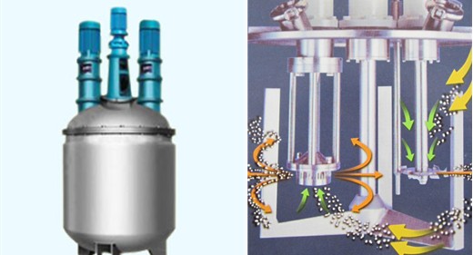 該類釜與不同的反應釜相比,具有多個驅(qū)動的優(yōu)點,各個驅(qū)動互不干涉及影響,按工藝需要完成攪拌、分散、乳化等功能,可單獨完成也可搭配使用,實現(xiàn)了一機多用。